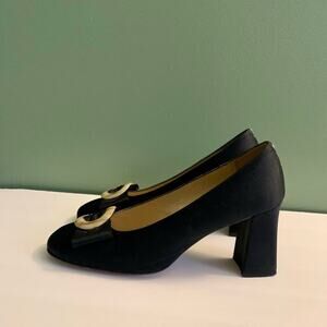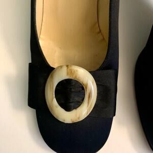 Black pumps by designer Jaime Mascaro. Satin material. Cute bow with beige tortoise embellishment. Heels height approximately 3”. Made in Spain. 7.5 USA shoe size. Vintage 80s. In excellent condition. The perfect shoe for a dressy occasion, the holidays or super cute with a white dress shirt and your favorite jeans. Elegant. Chic. Retro. Unique. Classic. Designer shoes.