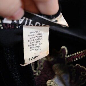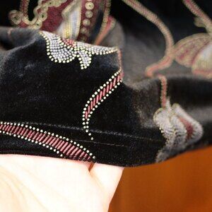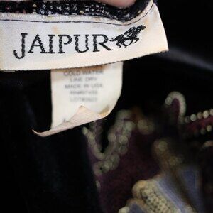 Vintage Jaipur tunic crafted from plush black polyester-spandex velour with ornate metallic butterfly and floral embroidery. The longline silhouette and soft stretch fabric offer a relaxed yet elegant fit, while the shimmering gold and silver threads give it a luxe, ethereal quality. Perfect for adding a touch of Whimsigoth charm to evening wear, layered looks, or creative festival styling. A true statement piece from the 80s–90s era with bold visual texture and artistic detail throughout.