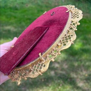 James Papalia ormolu convex bubble glass Hollywood regency solid brass fancy artisan made in USA handmade in America 1960s red velvet back free stand or hand