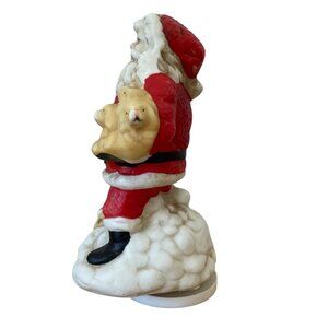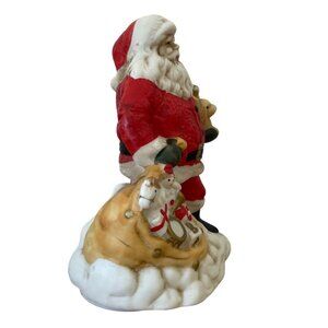 A charming Santa Claus musical figurine featuring a detailed sack of toys and a teddy bear. Made by Jamestown China, it's a delightful holiday collectible.