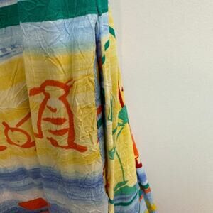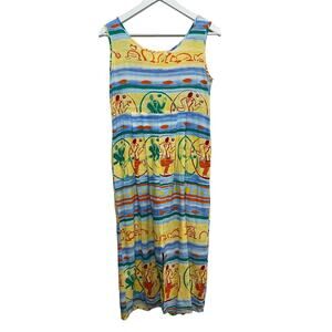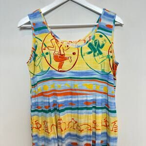 Vintage Jams World Janice Dress Dance Man Sleeveless Midi Tropical Hawaiian Dress. Sleeveless midi dress that has pockets! Dancing man pattern and what looks like animals with blue, yellow, green, and red pattern. Empire waist. The perfect coverup for a tropical vacation or pair with sneakers and sandals in the summer!