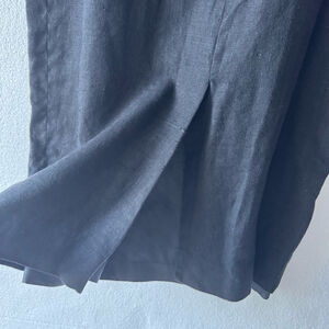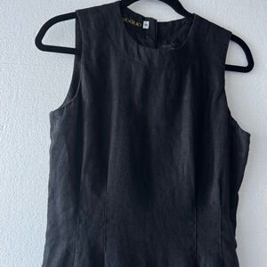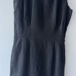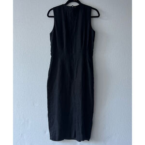 This is a pre-owned Jan Barboglio black dress, size 8. The dress is made of 100% linen. It features a sleeveless design, a round neckline, and a fitted silhouette that extends to the knee. The dress has a back zipper closure and a small slit at the back hem. The dress has a pit to pit of 17", waist of 15", and a length of 44". There are no visible stains or tears.