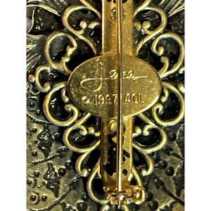This stunning Vintage Angel Pin, signed by Jane in 1997, features a gold-tone design adorned with faux pearl gems. Its dimensions are 2 1/4" by 2 1/4".