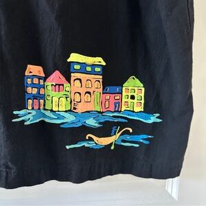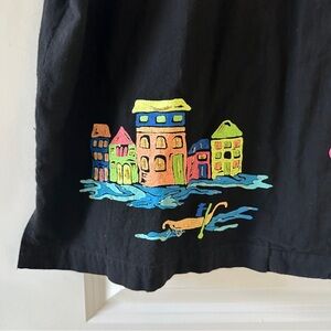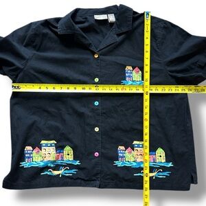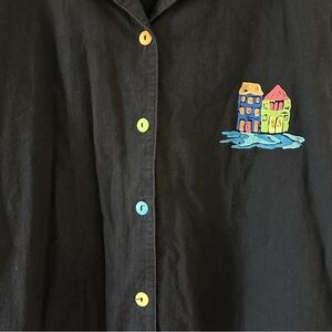 Vintage black button up shirt featuring vibrant painted Venice houses and waves with beading on the illustrations. The top has multicolored buttons for a playful touch. Relaxed fit, comfy and cute! Looks great solo or worn open with a tee, tank, or crop top.