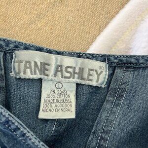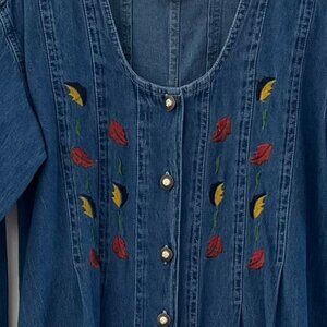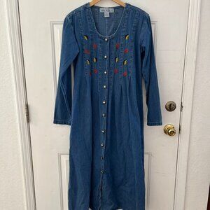 Vintage Jane Ashley Denim Embroider Leave Peasant Farm House Midi Dress Sz LR