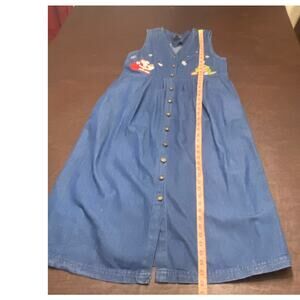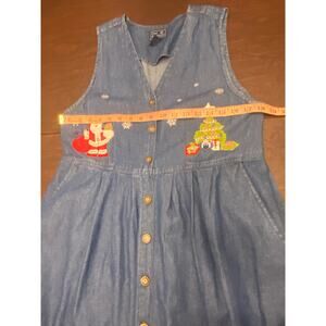 Adorable vintage denim Christmas jumper dress by Jane Ashley Petite. 100% cotton medium wash chambray denim with full button front, sleeveless cut, and festive embroidered holiday appliqués — Santa with gift bag and Christmas tree with presents. Snowflake accents add extra charm. Dress has side pockets.