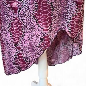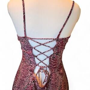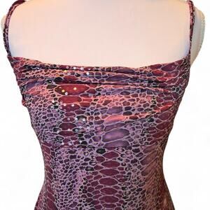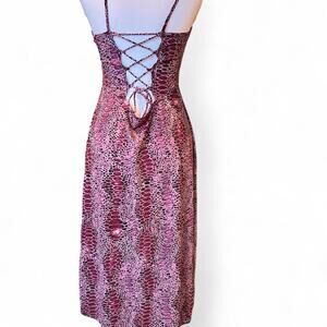 Rare early 2000s Jane Norman slip dress featuring a glossy pink and purple snakeskin pattern with iridescent sequin accents and an adjustable lace-up back.