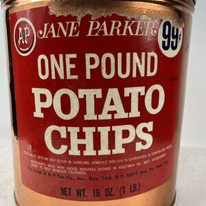 Vintage Jane Parker Potato Chips 1 LB A&P Paper Label Red Advertising Tin Can
