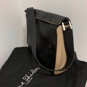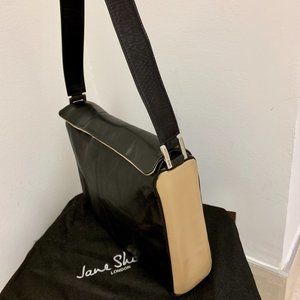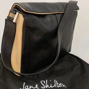 Sleek two-tone leather handbag. Tan and black buttery smooth leather with silver hardware. Magnetic snap closure. One exterior back zip pocket. One inside pocket with zip and cell phone pocket. Comes with duster bag. Excellent condition inside and out. The size is 12" wide x 10" high x 3.5" deep. Shoulder strap drop is 12".