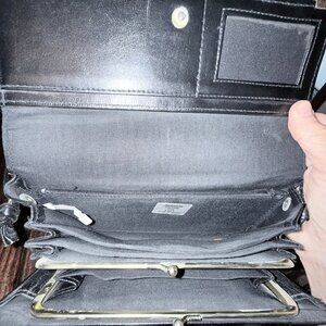 Black vintage Janette Tilton shoulder purse. 8.5 inches wide and 5 inches tall. Multi section bag. Purse snaps shut, has inner coin holder that clasps shut. Open pockets and zipper pockets with driver license holder inside. Tag inside bag reads "Janette Tilton 1219 Y801 made in Macau" Shoulder strap does not detach it is 40.5 inches long. Gently used.