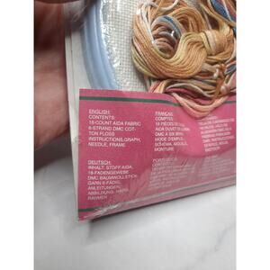 Kit includes: 18 count Aida fabric, 6-strand DMC cotton floss, instructions, graph, needle, frame.