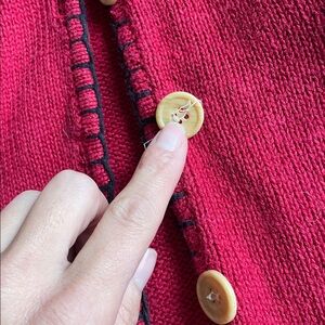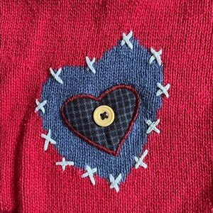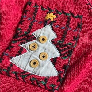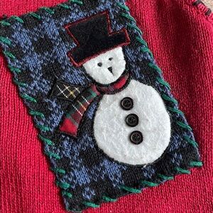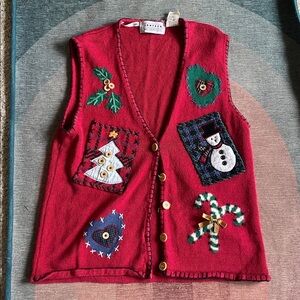 Red sweater vest with Christmas-themed patches including a snowman, Christmas tree, and candy cane. great pre loved vintage condition size medium