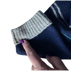 Vintage Jantzen men's pullover wool knit sweater. Sweater is gray on top with dark blue on the bottom and blue sleeves. It has a two button placket and the buttons are leather. Sweater is made of 100% wool and is a man's vintage size medium. Please check measurements to ensure fit.