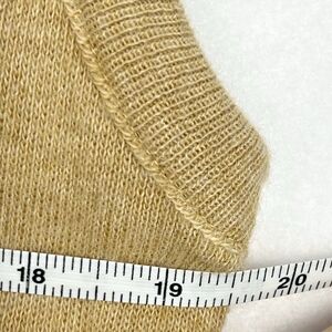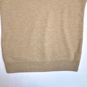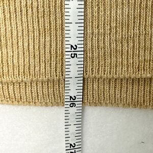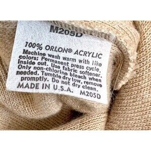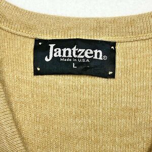 Vintage Jantzen men's sweater in size L, featuring a classic USA-themed design. Made of camel-colored Orlon Acrylic in a solid and tight-knit pattern, this long-sleeve pullover has a V-neckline. The sweater is suitable for casual wear during the Fall and Winter seasons and is crafted in the United States.