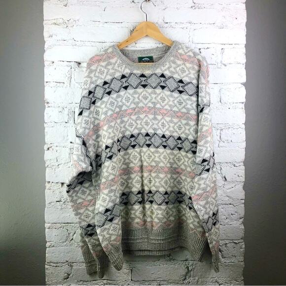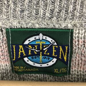 Super soft vintage 90’s Y2K Jantzen crew neck sweater in a men’s size XL. In colors of pink grey white and black. Made in Canada. Has some spots here and there due to age. Measurements approximately chest 27", length 28". In great vintage condition.