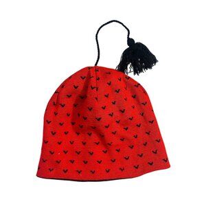 This cozy red knit hat from Janus features a black bat print and a playful tassel detail. Its vintage design adds a touch of nostalgic flair.