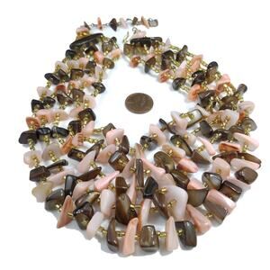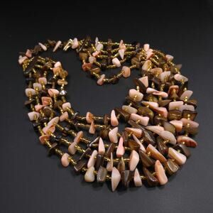 *Description: This is a beautiful shell 5 strand necklace which was made in Japan in the 1950s. This necklace has beautiful brown and pink shells and large seed beads in between the shell beads. This is a great necklace. It is a little heavier due to the weight of the shells. Please review measurements. This is a great boho statement necklace and would make a great addition to your vintage jewelry collection.