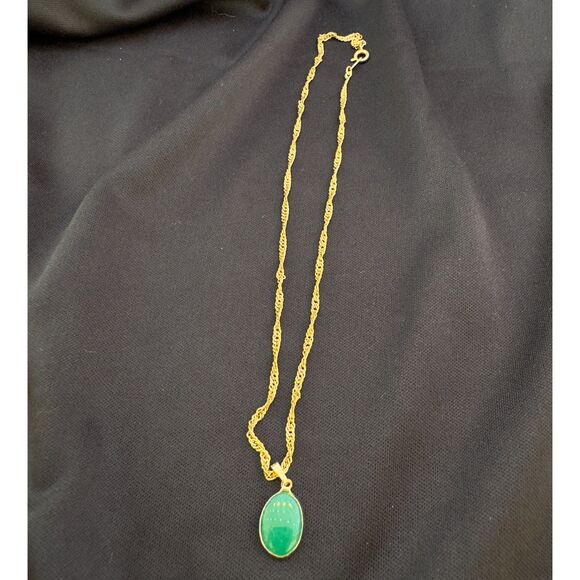 Dainty green crystal on am antiqued gold tone necklace, marked Japan. Its nin good condition with some light wer on the clasp.