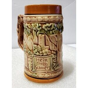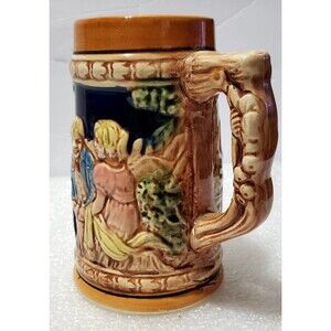 Vintage Japan Beer Stein 5.5" Ceramic Raised Scene German Script Rustic Collecti