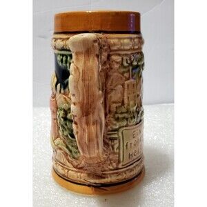Add a touch of old-world charm to your collection with this vintage beer stein from Japan, standing 5.5 inches tall. Features beautifully hand-painted raised relief scenes of a boy and girl with a picturesque outdoor backdrop, plus German script detailing. Marked Japan, its perfect for collectors, rustic décor, or unique drinkware displays. Shows minor wear typical of vintage ceramics, but no major chips or cracks. From a smoke-free homegreat for display, gifting, or nostalgic pub décor.