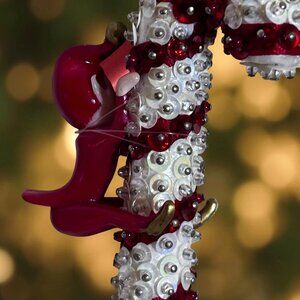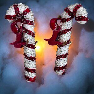 A charming pair of mid-century Japanese sequin candy cane ornaments, each with a climbing pixie elf in classic knee-hugger style. These were hand-assembled in the late 1950s to early 1960s, when Japan was exporting whimsical Christmas decor to Woolworth, Sears, and five-and-dime holiday counters across the U.S.