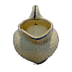 This charming mid-century creamer features a textured basket weave body, crackle glaze finish, and a delicate floral decal with pink and blue blooms. Accented with blue trim on the rim and base, it’s a lovely example of Japanese export ceramics from the 1950s.