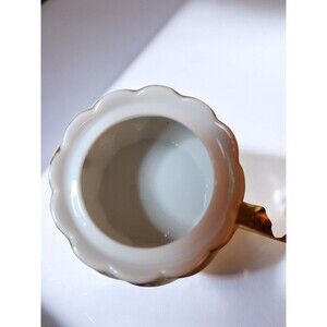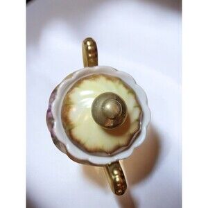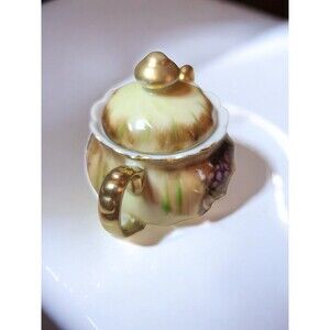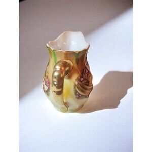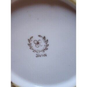 Gorgeous hand-painted lusterware set featuring a bright fruit motif (bananas, oranges, grapes, and more) with elegant gold trim and handles. Made in Japan, marked on bottom with clover and laurel wreath.