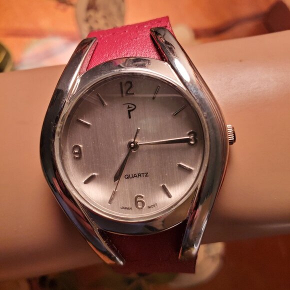 Vintage Japan Movt Ladies Watch with Genuine Red Leather band. I cannot find the logo anywhere, but it is quite unique -- a P with watch hands within the curve of the letter. Measures 7" from Buckle to last hole. Silver Face is 1 1/4" across. Will come with a fresh battery.