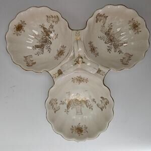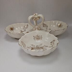 Vintage Japan Porcelain 3 Section Serving Dish Gold Floral Trim Handle