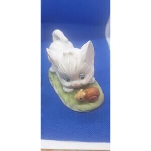 Adorable set of 3 vintage porcelain cat figurines. The white kitten playing with a snail (right) is marked Lefton 1315. The gray striped kitten and smaller kitten with a red bow are unmarked but display similar Made in Japan quality and mid-century charm.