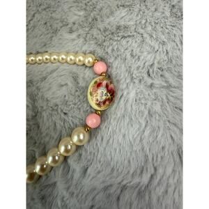 Beautifully crafted vintage-style necklace featuring a strand of creamy faux pearls accented by hand-painted porcelain beads with intricate floral designs in gold, red, and blush. The necklace includes soft pink beads and gold-tone spacers, bringing together an elegant, romantic look. Made in Japan and finished with a secure spring-ring clasp, this 27-inch piece is perfect for collectors or as a statement accessory for formal and vintage-inspired outfits.