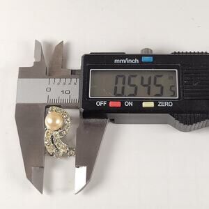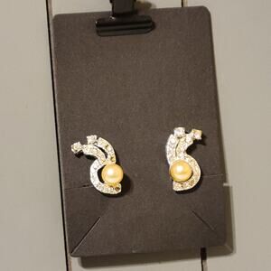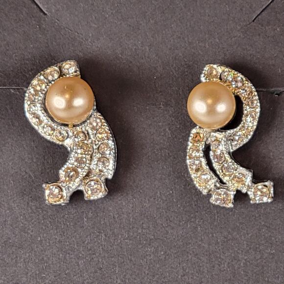 Vintage Japan clip-on earrings featuring a silver-tone metal setting with rhinestones and faux pearl accents. Elegant curved design. Approx. 0.55 inches in length.