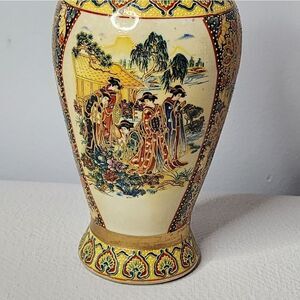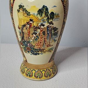 This vintage Japanese vase is a unique addition to any collection. Its Satsuma style and hand-painted design showcase beautiful birds on a multicolor floral pattern. The vase is made of porcelain with a moriage finish and gold trim.