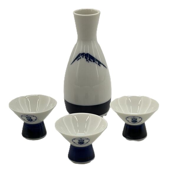 Vintage Japan Shirayuki Sake Set Blue & White Porcelain Carafe & 3 Cups Set