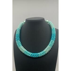 Vintage Japan Signed Ombré Aqua & Turquoise Blue Choker Beaded Necklace