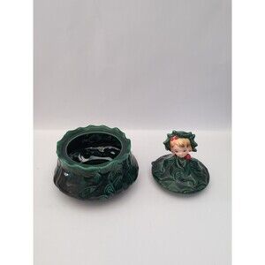 Adorable angel faced girl wrapped in holly. This covered dish is in excellent condition with no chips/cracks (there is one very minor paint nick on one of the holly leaves but won't pick up in photo). I believe it was made by top line imports Japan many years ago. She measures approx. 61/2" to the top of her bonnet. Hard to find vintage item. Nonsmoking home.