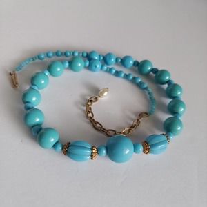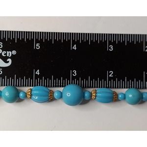 Vintage Japan Two Tone Blue Bead Necklace Single Strand Graduated Ribbed Aqua