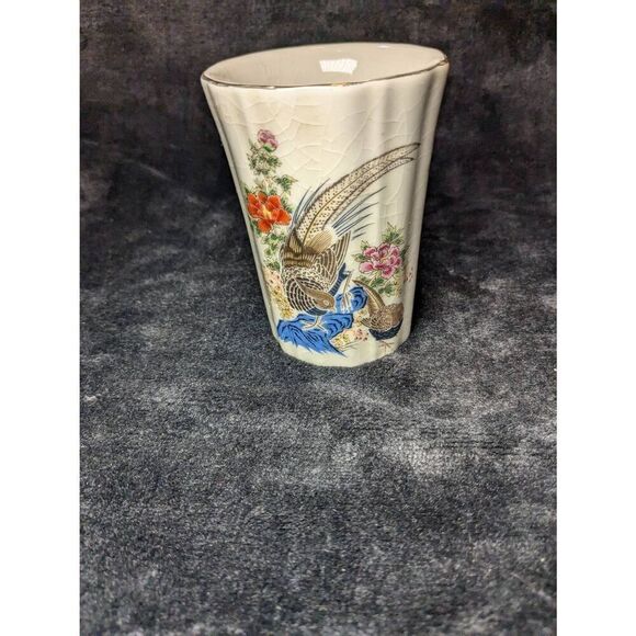 4.5 in high vase or glass porcelain gold rimmed cop featuring pheasants made in Japan