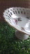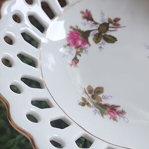 Beautiful moss rose serving piece with removable pedestal. Lovely cutwork design with gold tone edging, surrounding rose placement and along pedestal.