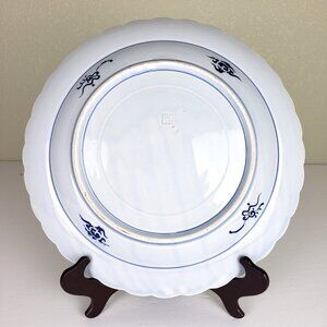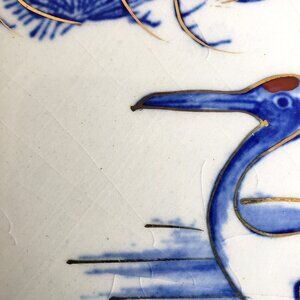 Extra-large vintage Imari style charger or plate is hard to find in this size and at this price. The shallow footed plate or bowl is deep cobalt blue with cinnabar red and gold highlights over a white earthenware. It is stunning displayed on the wall or table. The plate is in very nice vintage condition with no chips or cracks. There is some crazing (the effect on pottery which causes it to have a web of tiny cracks over its surface). These are NOT cracks in the actual structure of the pottery, just the glaze. The plate features two cranes in the center with a bonsai tree and small flowers around the border of the charger. It has a gold rim with highlights of gold throughout the plate. The hand-applied gold on the scalloped edge has rubbed off in a few places. Vintage items are sold as is, so please study all photos as part of the description. Hand wash - no oven, dishwasher, or microwave.