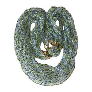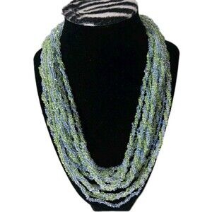 This Vintage Japanese 70's Glass Seed Bead & Faceted Crystal Multi-Strand Necklace is a statement piece that features a push lock closure and a layered design. The necklace is 19 inches in length and is adorned with blue faceted crystals and gold-tone metal accents. The vintage piece is adjustable and perfect for all occasions, adding a touch of beauty and bohemian flair to any outfit. Made in Japan, this unique necklace showcases a cluster setting style and is a lovely addition to any jewelry collection.