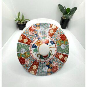 This vintage Japanese Arita Imari Ware porcelain tureen features exquisite floral and geometric patterns, adding a touch of elegance to dining settings. The multicolor design showcases traditional craftsmanship. Approx size 7 1/4" diameter x 10 1/4" across the handles x 6" tall.
