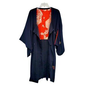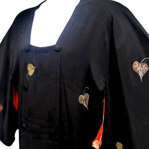Vintage Japanese Black Silk Kimono Haori Hand Painted Metallic Leaves Red Lining
