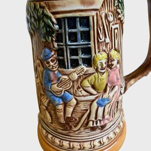 ceramic beer stein, vintage beer mug, embossed design, raised relief, traditional German stein, glazed pottery, handle mug, folk art mug, musical village scene, rustic, Old World, Oktoberfest style, collectible, folk style, cottage tavern, alpine lodge, nostalgic Europe, heritage decor, folkloric, cozy cabin, vintage barware