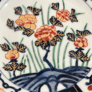 Japanese porcelain, hand-painted in Hong Kong. A floral display of pinky orange and blue with gold detailing on a white background. In age-appropriate condition with no issues with the brass being untouched in its natural aged patina. Hong Kong stamp on the bottom.