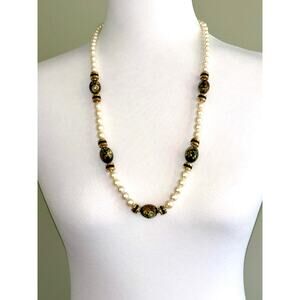 Vintage Japanese Faux Pearl Enamel Floral Beaded Statement Necklace