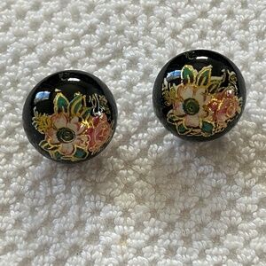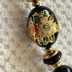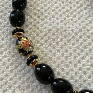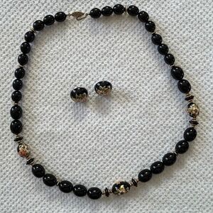 Vintage Japanese Floral Enamel Black Bead Necklace and Earring