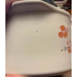 Vintage Japanese Galleria Collection Stoneware Ramekin Crock w/Lid. Very pretty piece of cookware features pink floral pattern, designed for use in microwave, oven, and is dishwasher safe. Made to go from oven to table. Comes w/pale grey lid. Crock measures 6" (handle to handle), 5" inner diameter, 3" tall. Lid is 4 1/2" w/2" handle. Excellent condition. Very small production flaw dot of paint on outer side of crock. No chips, cracks, or breaks. Comes from a smoke free, pet free home.