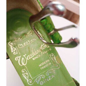 Gorgeous Vintage Washington shoes (my best guess is 70's or 80's) in a Japan size 22 1/2, which google says is a size US 5.5. The insole is 8.75" from heel to toe, please compare to a pair of open toe shoes you own. The strap across the toes is 4.5" long, so pretty narrow, probably M/B width. The insoles are green leather and in gold print they say "Creation Washington Ginza/Tokyo Modern Fashion". The deep yet bright green is just so gorgeous! They just look well built the way shoes used to be!