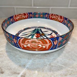 The large bowl has traditional Imari colors of cobalt blue, rust, light orange and green. This beautiful late 20th Century dish is in excellent vintage condition with no chips or cracks but there are minor wear on the gold gilding.